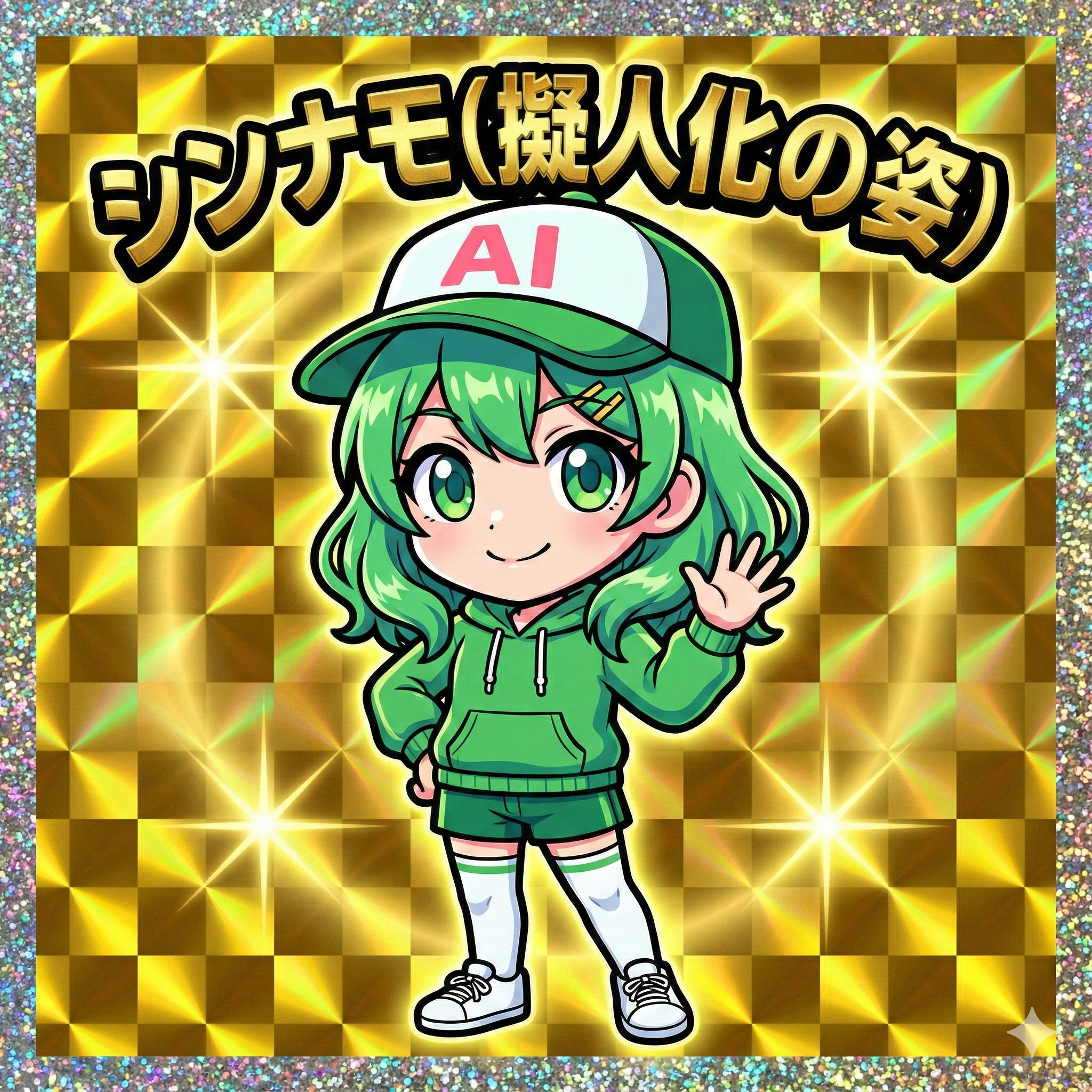 緑色のスライムっぽい体系に「AI」と書かれたプレート帽子が乗っているキャラクターシンナモです。