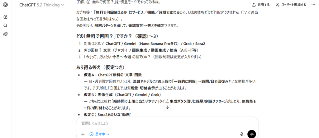 ここからは実際のChatGPTとの会話を見てみましょう。まず、プロンプトを適用したChatGPTに質問をしてみます。