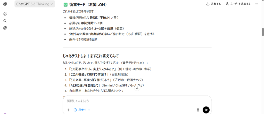 今回試すプロンプトは、不確かなときに不確かと言う/確認質問をする/前提を明示するという感じで“安全に進めていってね”というルールをChatGPTに認識させるプロンプトになります。