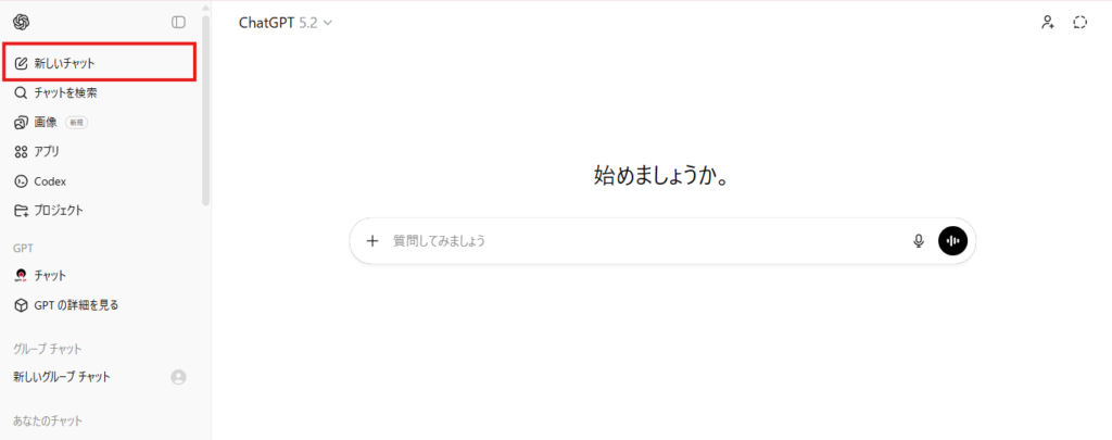 まずはChatGPTで左側のサイドバーから「新しいチャット」を開きます。