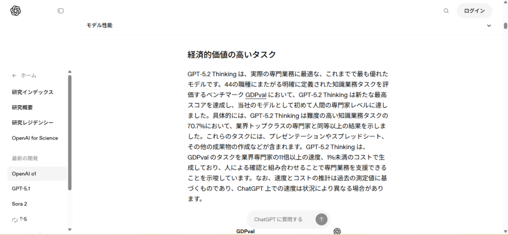 OpenAIによると、実務能力を測る新指標「GDPval」では勝率70.9%を記録し、従来の GPT-5 系モデル(38.8%)を大きく上回るスコアを叩き出しています。史上初めて「人間の専門家レベル」に到達したモデルとされていて、「AIが本気で仕事相手になってきたな…」と感じさせる結果になっています。