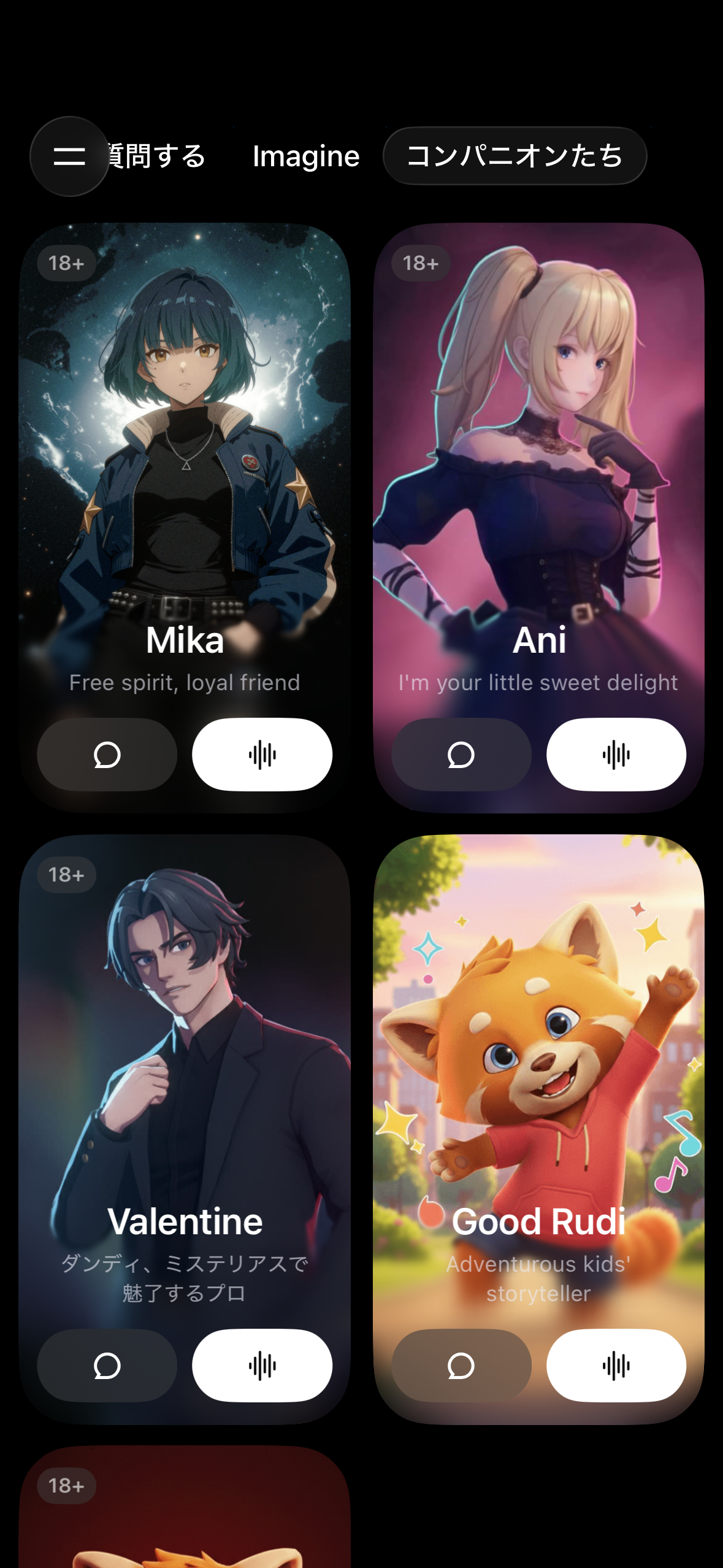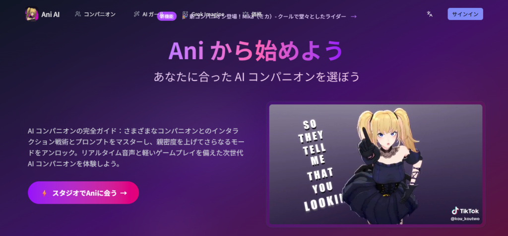 Companions(コンパニオン)は、Grokの中でキャラクター(アバター)と会話できる機能で、Aniはその代表的なキャラのひとりです。