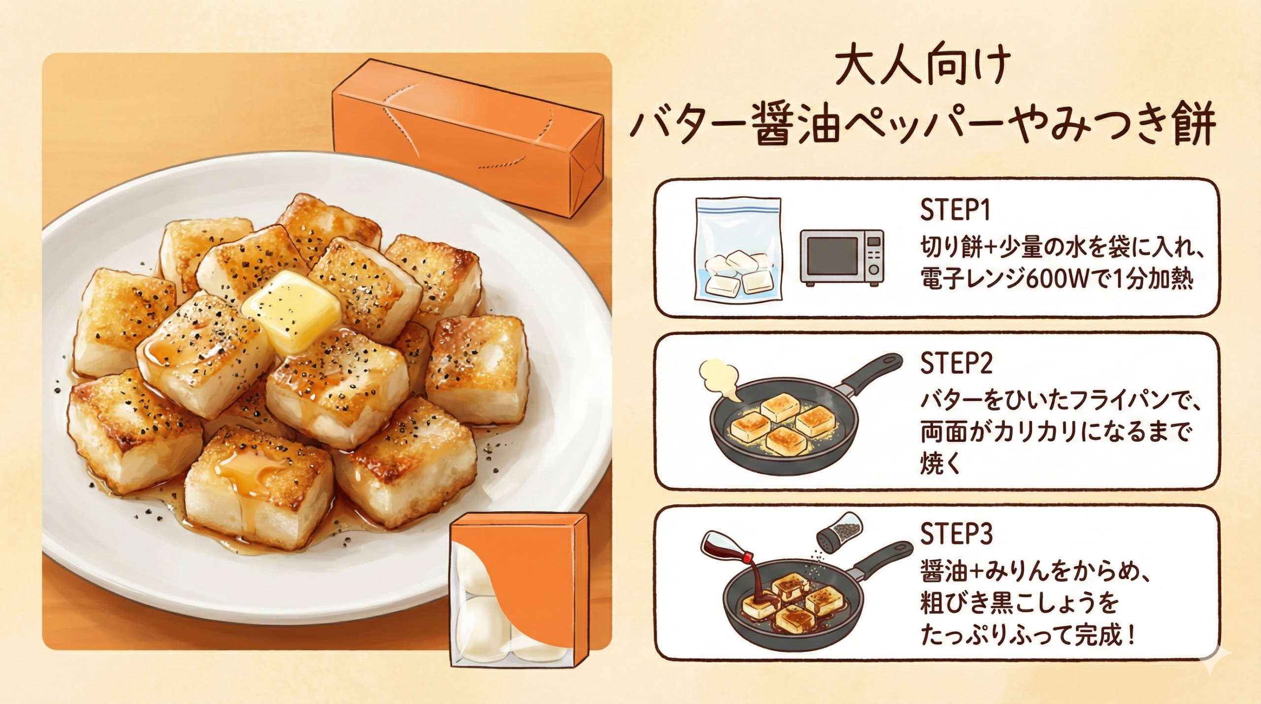 - 大人向けアレンジレシピ「バター醤油ペッパーやみつき餅」