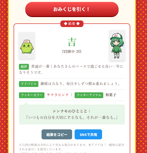 今回のおみくじは、結果に「7段階中◯位」みたいな順位も表示しています。