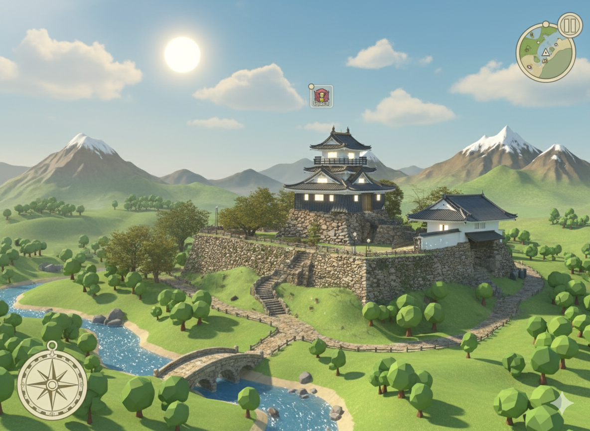 何という完成度!筆者も思わず「おー!」と声が出ました!お城本体ももちろんですし、周りのフィールド、左下のコンパスやミニマップまで!極め付きにはミニマップの上にポーズボタンまである徹底ぶり!