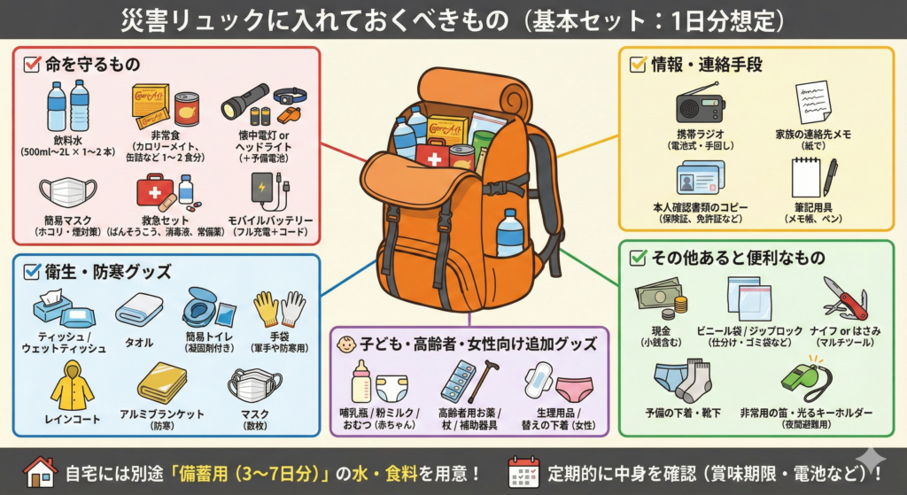 • このリュックは「発災直後〜避難所に着くまで」の1日分想定