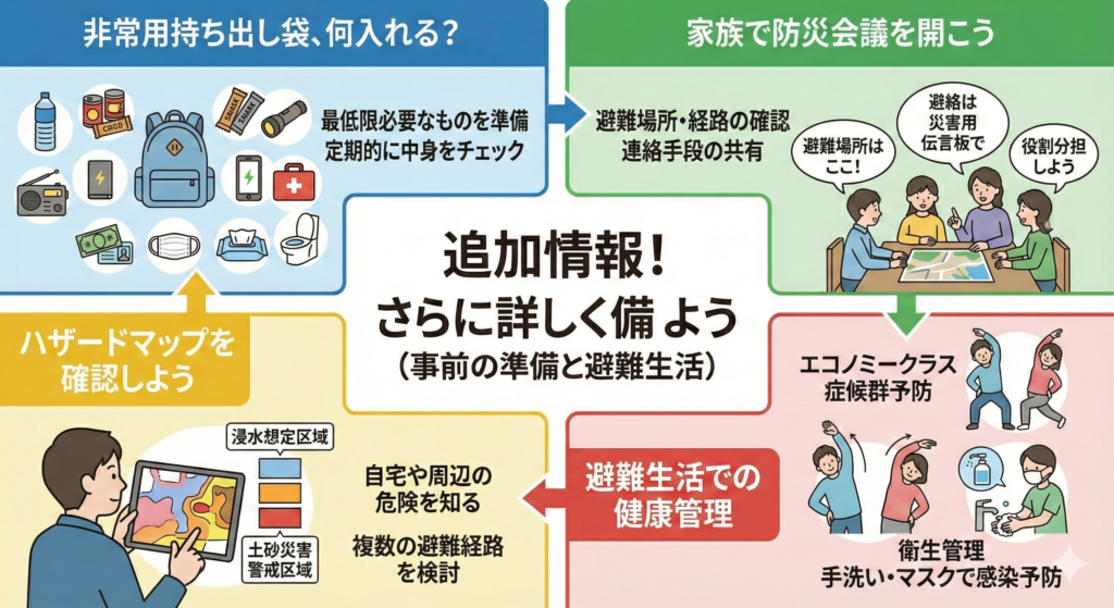 • 日頃の備えとして「家具の固定」「枕元に靴とライト」「簡易トイレ・水・食料の備蓄」…など