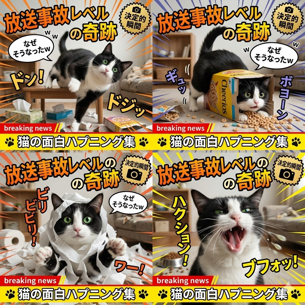 下記のプロンプトで4回出力してください テキスト メイン: 放送事故レベルの奇跡 サブ: 猫の面白ハプニング集 (下部の帯) その他: なぜそうなったw (吹き出し)、決定的瞬間 (右上のスタンプ) 配色 背景: 一般的なリビングルーム(生活感あり、特定のブランド家具なし)。 文字: #FFA500 (オレンジ) や #FFFF00 (黄色) のポップな色。 アクセント: 漫画のような集中線の色。 フォント メイン: バラエティ番組風の、楽しげな極太フォント。 サブ: 親しみやすい丸文字。 レイアウト テキスト配置: 上部に大きくメインタイトル。文字に動きをつける(斜体、カーブ)。 猫の顔の近くに「w」や吹き出しを配置。 装飾・図形: メインの被写体は猫(または犬)。 ジャンプに失敗して変な体勢になっている瞬間、変顔、物をひっくり返した瞬間など。 動きを強調するモーションブラー(被写体ブレ)や、漫画的な効果音エフェクト(ドン!、ビヨーンなど)。 散らかった部屋の様子を隠さず写す。 スタイル ペット動画、ハプニング、コメディ、決定的瞬間、躍動感、親しみやすい、スマホ撮影風