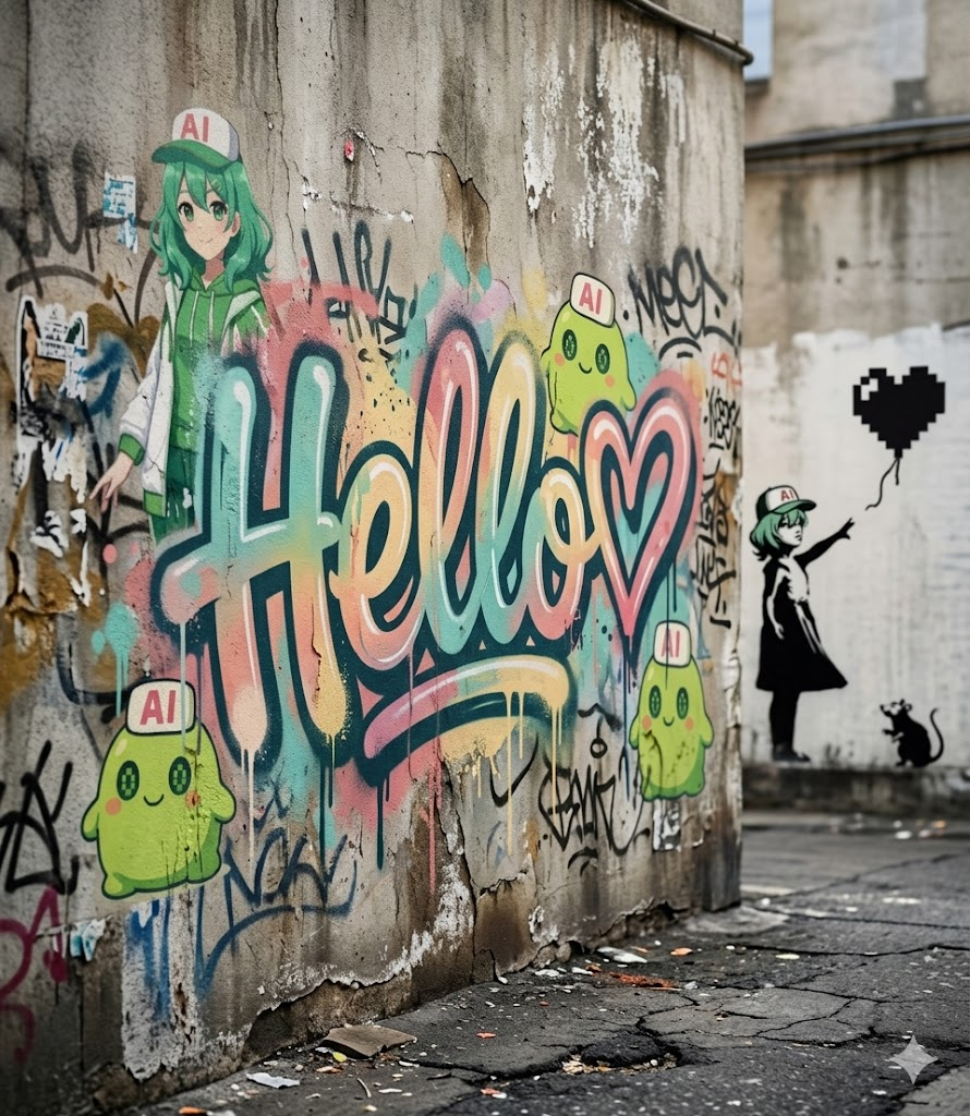 スプレーアート風テキスト 「好きな言葉を入れてね!」という文字を、壁にスプレーで描いたグラフィティアートとして表現する。 色使いは、文字の意味・響き・自動的に推論する 文字スタイル: グラフィティーフォント(視認率80%)、ドリップ(垂れ)、スプラッシュ、オーバースプレー、塗料のにじみ、荒いエッジ、広げたストローク、ボカシ壁の背景:コンクリート壁、ひび割れ、割れた塗装、汚れ、シミ背景には文字のテーマに応じた要素(シンボル、シルエット、テクスチャ)を自然に反映する構成: 中央またはややずれた配置、自然なストリート配置、パースの視界感動: 高精細、シネマティックライティング、シャープフォーカス、超リアルな質感 雰囲気: 生々しい、反抗的、アンダーグラウンド、リアルなストリートカルチャー、画像のキャラクターも書いてほしい。文字は緑いろにしてほしい。