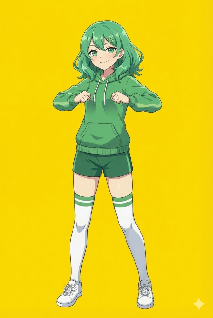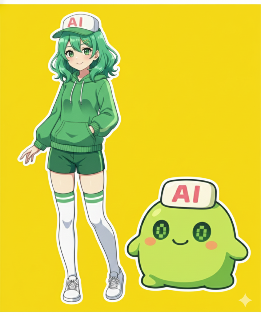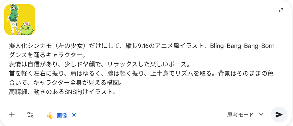 Nano Banana Proの良い点は、イラストの雰囲気を言葉で細かく調整できるところです。「背景はシンプルに」「キャラクターを中央に配置」を意識することで、ダンスが映えるビジュアルに仕上げることができました。