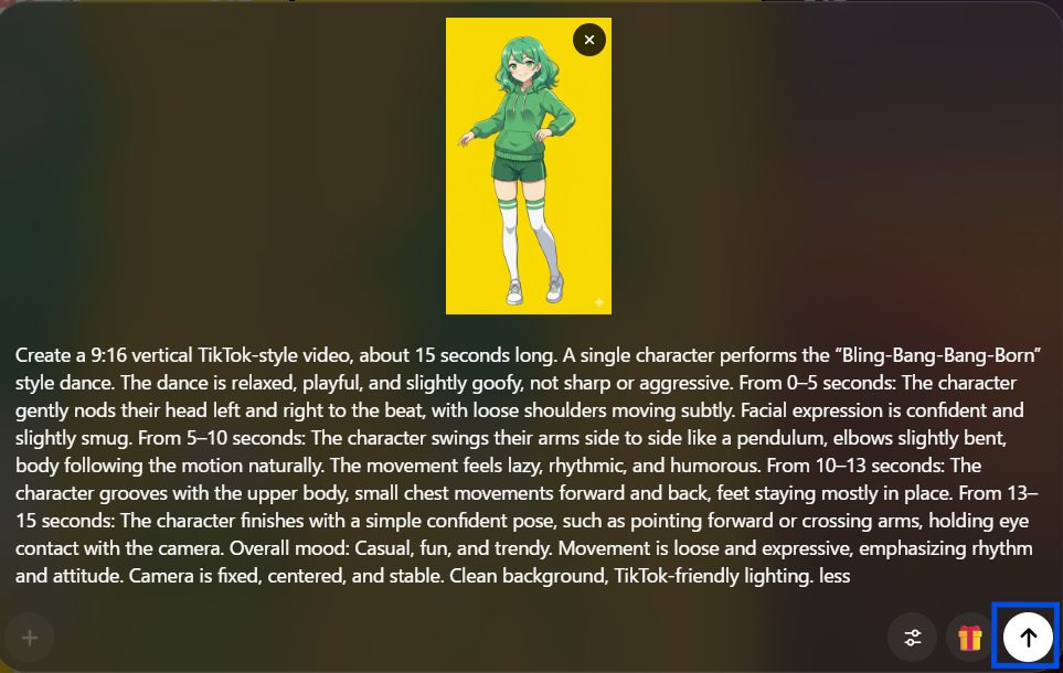 次に使用したのが Sora2 です。Sora2は、テキストから動画を生成できるAIで、動きのある表現が得意な点が特徴です。ここでは、Nano Banana Proで作成したキャラクターイメージをもとに、「Bling-Bang-Bang-Born」のダンスを踊る動きを指定しました。