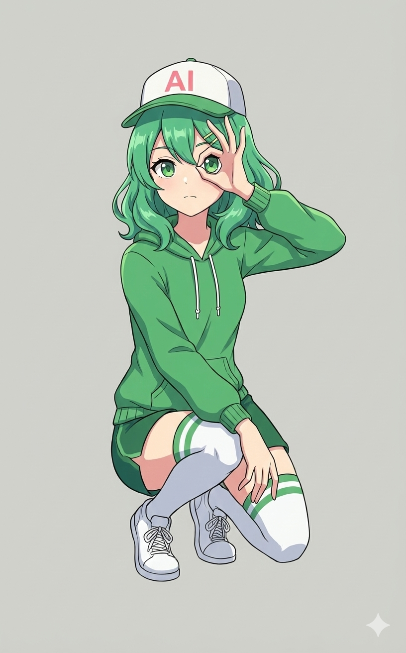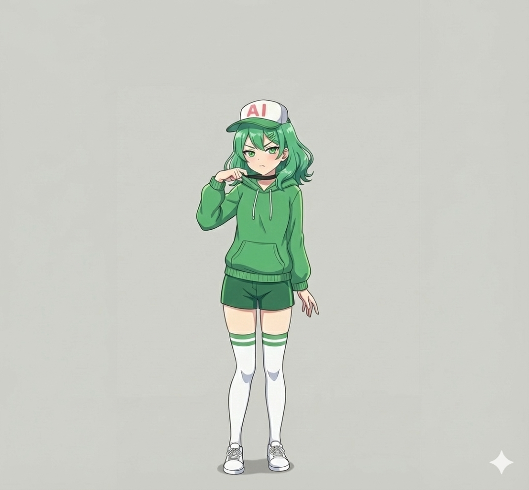 (髪型・顔立ち・目の色・帽子「AI」・パーカー・ショートパンツ・靴下・靴、色味も同じ)