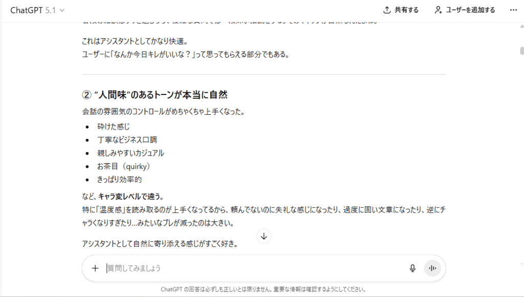 ChatGPTの回答② 会話トーンの自然さが大きく向上