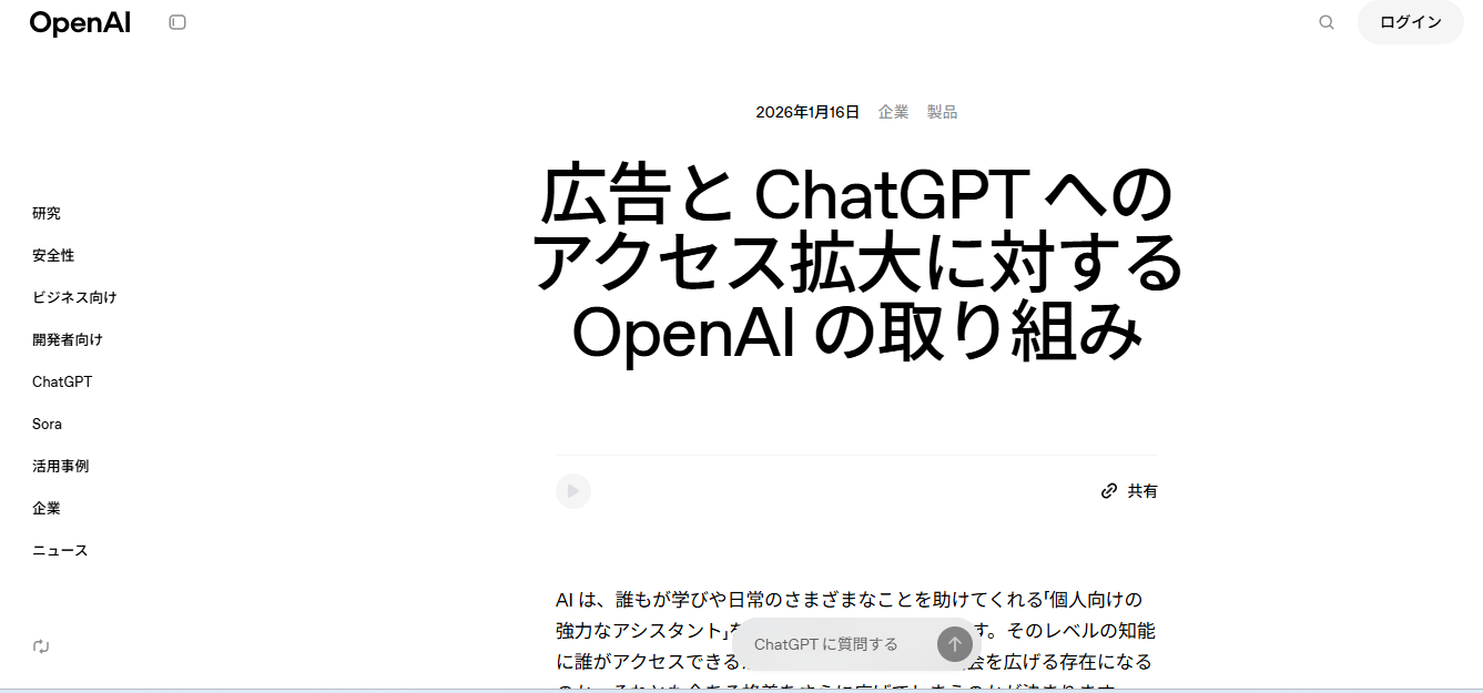 OpenAIは試験的にChatGPTへ広告を導入…一方のGoogleは、広告部門VP(AIを活用した広告運用の責任者)がGeminiへの広告掲載を否定。両者の行く先に注目だも。