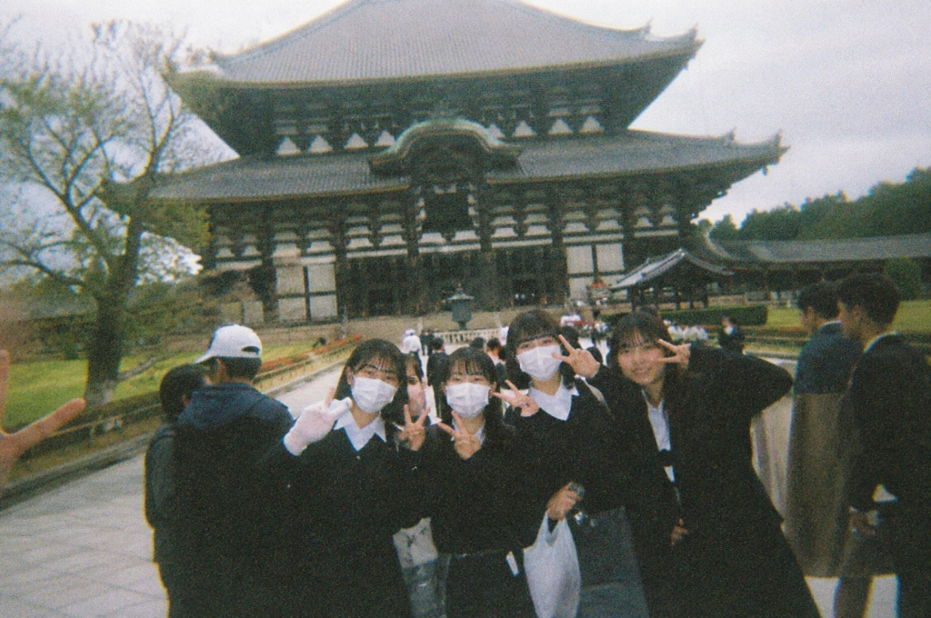 低画質な使い捨てカメラで撮影した1枚の日常写真。日本の高校生が撮影した下手くそな写真。修学旅行