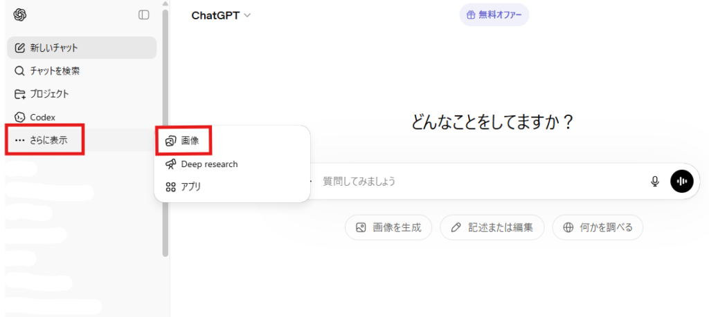 ↑赤い印の「さらに表示」を選択して、右に出てきた「画像」を選択することにより画像生成することが出来ます。