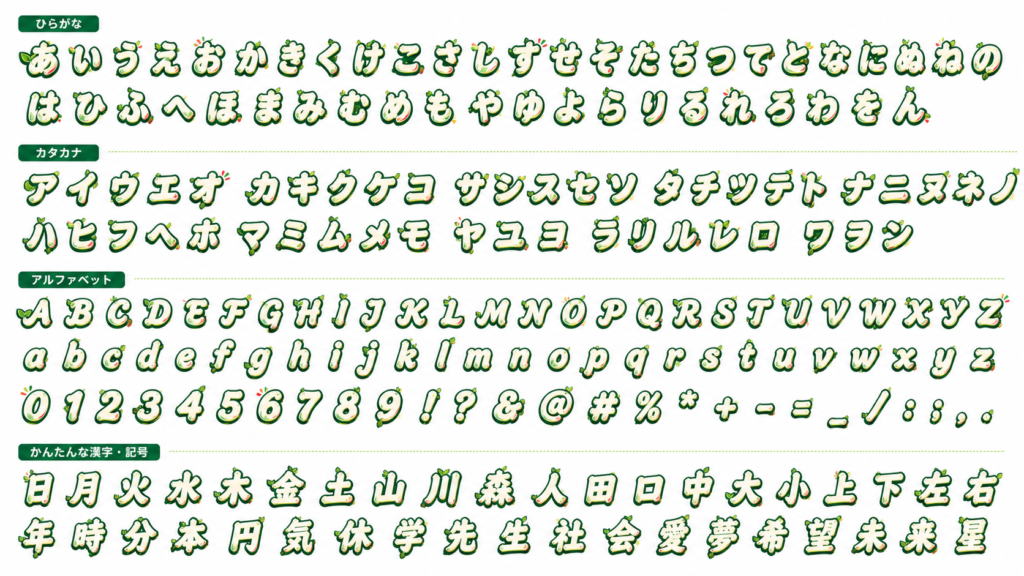 この文字デザインをもとに、ひらがな・カタカナ・英字・簡単な漢字を並べたフォント見本帳画像をつくって。