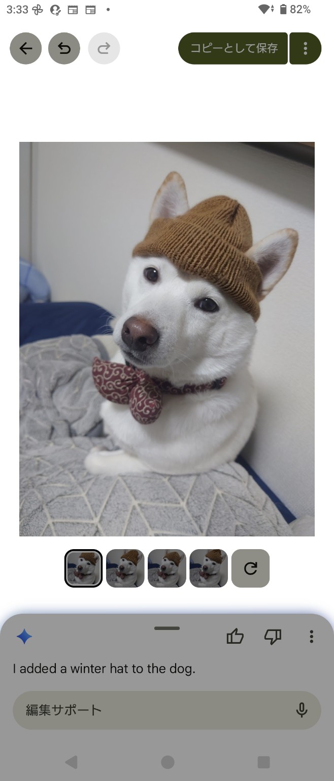 すると、犬の頭の位置や角度に合わせて、ニット帽が自然に追加された画像が生成されました。