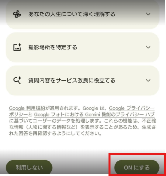 Geminiを有効にするように案内されますので「ON」(赤□部分)をタップします。