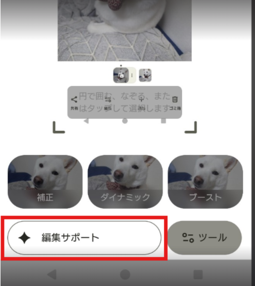 編集したい写真を選んで「編集」をタップ、次に「編集サポート」をタップ!後は、AIni編集してほしい内容を伝えるだけなも!