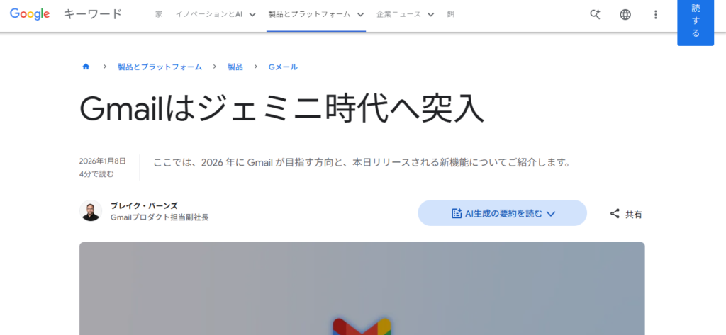 今回のポイントは「新機能追加」よりも、GmailのAI機能が“標準機能”として広がり始めたことです。