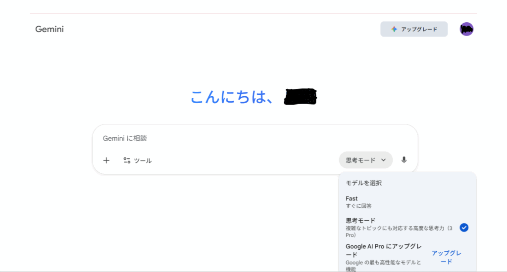 ブラウザ版Geminiのモデル切り替え画面を確認