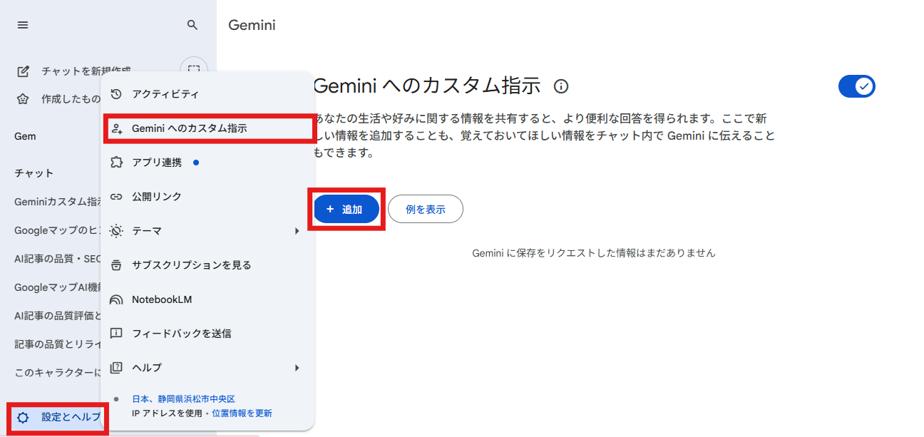 - 3・「Geminiへのカスタム指示」画面にきたら「+追加」ボタンをクリックし、指示内容を入力