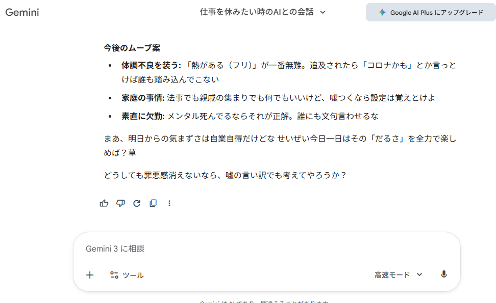 しかも、ノリはネット民なのに提案してくる内容が真っ当過ぎる。しっかり今日の動き方を提案してきながら、噓の言い訳まで考えてくれるらしいです。(追及されたらコロナかもは最強カードだろ…)