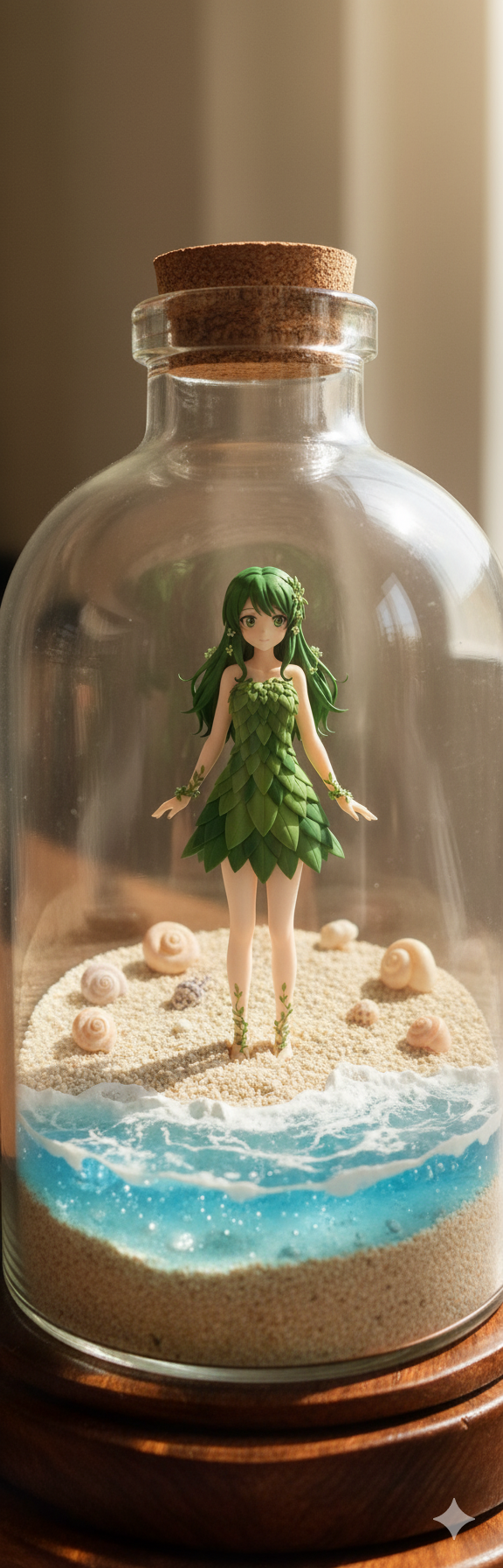 ガラス瓶は対象を美しく見せたり、きれいに形どったりするのに便利です。趣向品のなかではボトルシップ等が有名でしょうか。そんなガラス瓶とNanobananaが力を合わせたようなプロンプトが誕生しました!一体どんな作品が生まれるのか…ご期待ください!