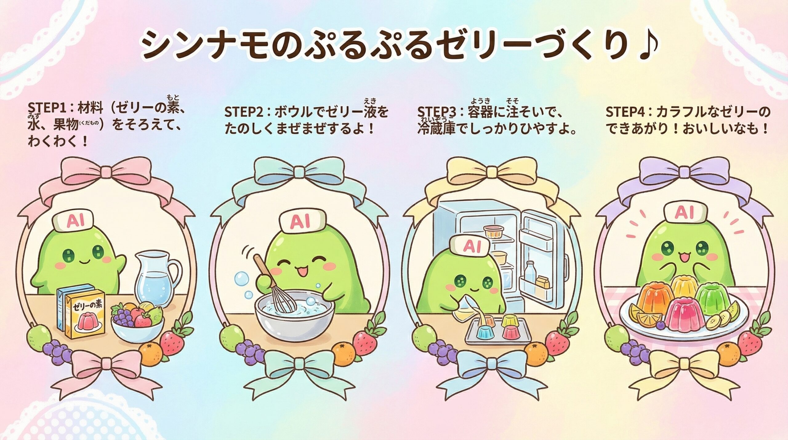 そのデザインを維持したまま「ゼリーづくりの絵本レシピ」を生成してみました。