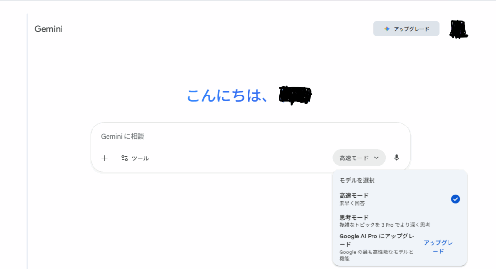 その後、マイクボタンの左横、モデルボタンをクリック。思考モード(端末によってはThinkingモード)に変更します。
