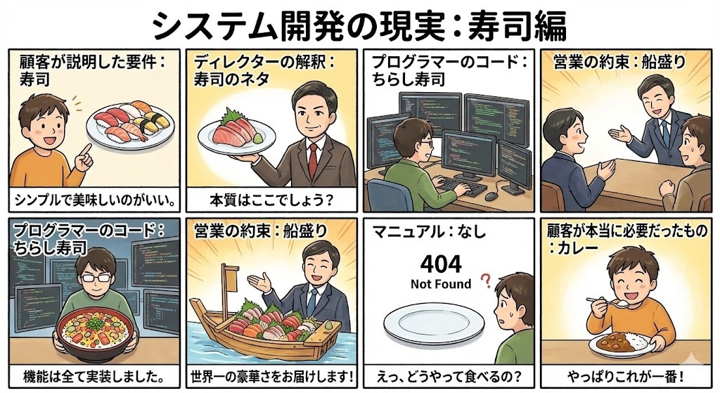 こちらはネットサーフィンをしてれば誰しもが目にする風刺画です!システム開発の実情をお寿司に例えているようですね。