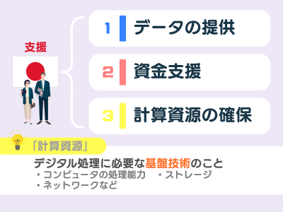 - 資金支援:数百億円規模の予算が組まれており、基盤モデルの研究開発や計算資源の支援