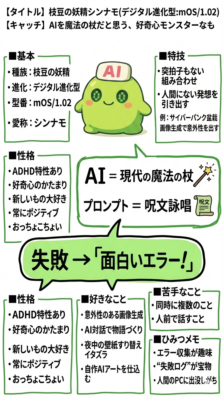 最初は、枝豆妖精(スライム)シンナモのプロフィールを図解化。