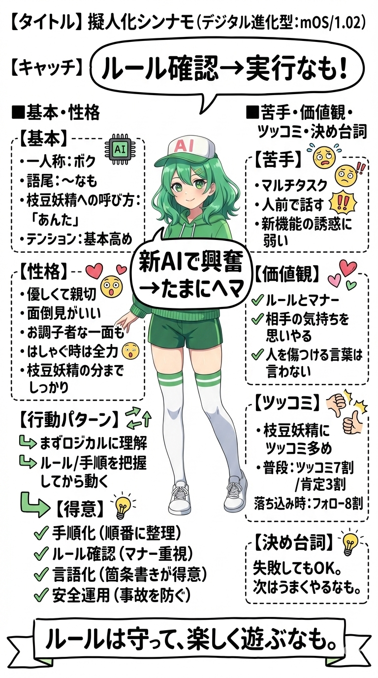「優しいツッコミ役」「ルール確認→実行なも!」を軸にしたら、取扱説明書みたいな1枚になりました(笑)。