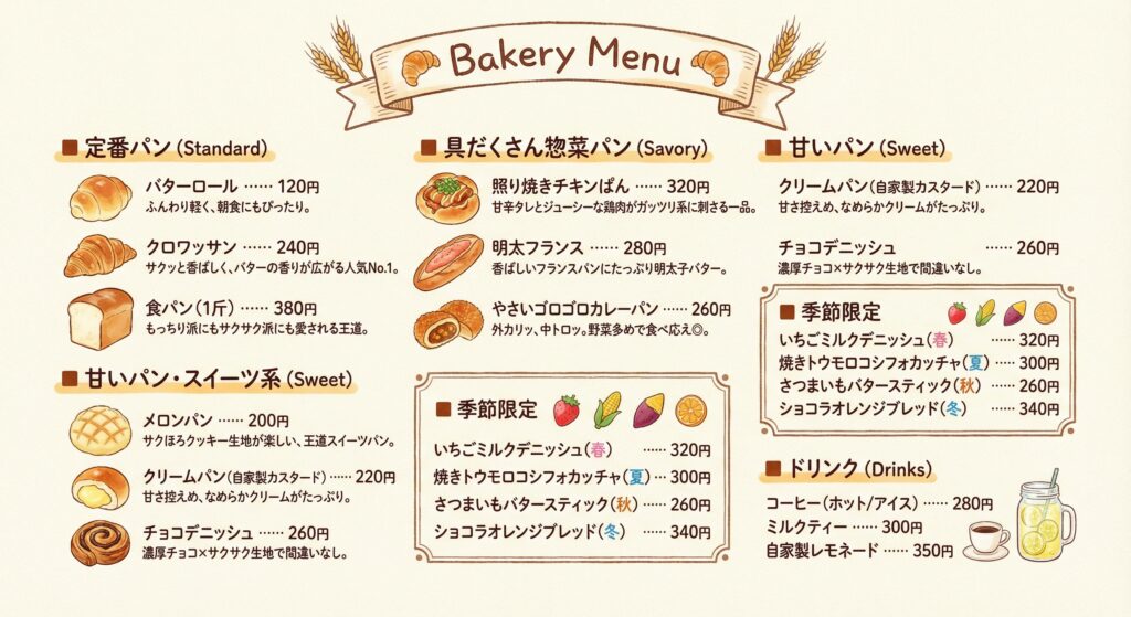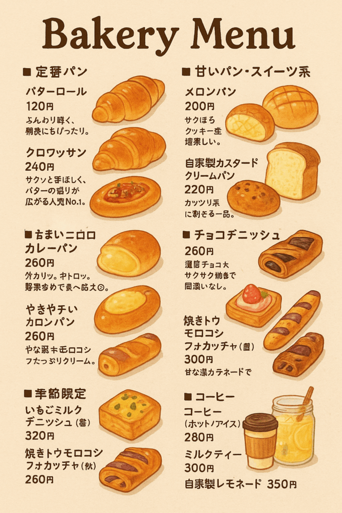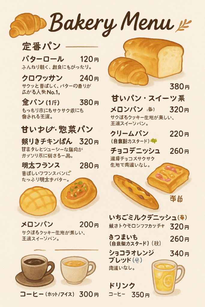 「以下のパン屋さんメニュー表をイラスト入りでおしゃれに可愛く作ってください」