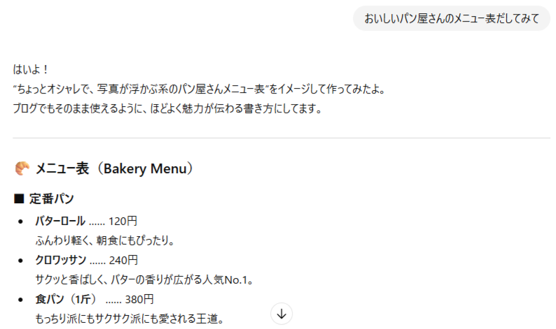 (以下ChatGPT生成の架空パン屋メニュー文コピペ)とリクエストを送信👇