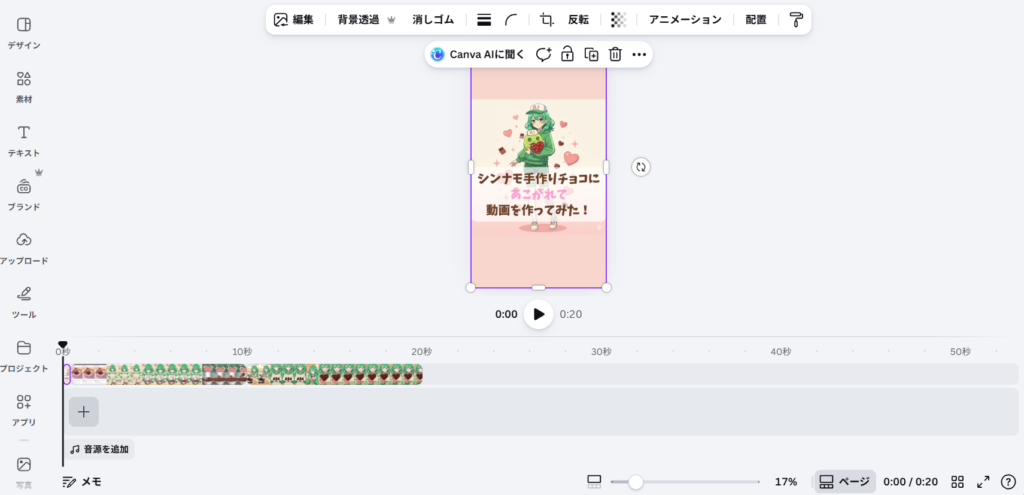 Soraで作成した2つの動画をつなげるために、今回はCanvaを使用しました。Canvaは直感的に操作でき、動画を並べて配置するだけで簡単に一本の動画にまとめられます。細かい調整もしやすく、初心者でも安心して使える編集ツールです。