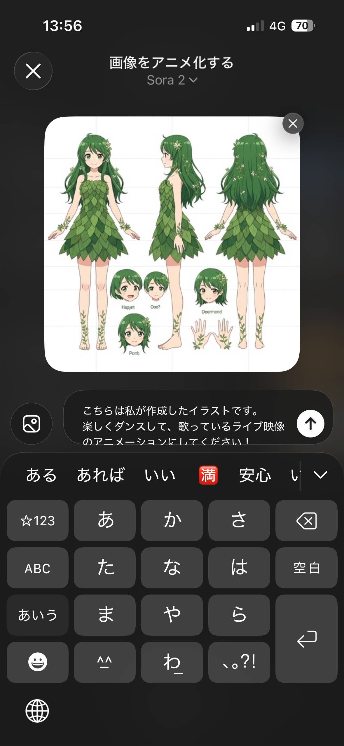 まずSora2を起動し生成画面へ行きます。「画像をアニメ化する」を選び、そこで下記のプロンプトを入力してください。
