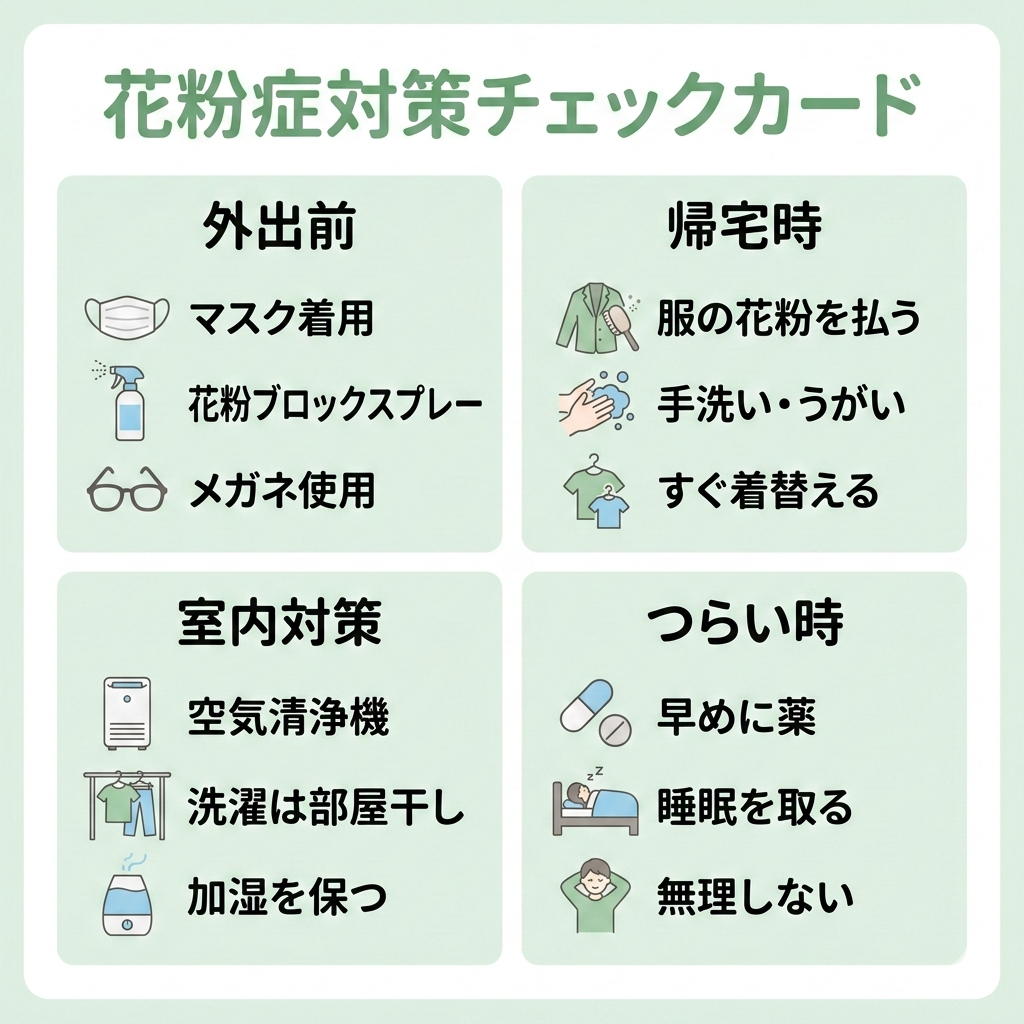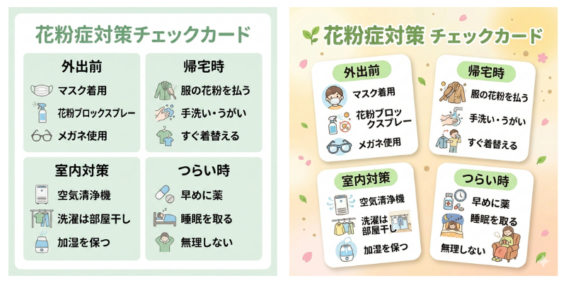花粉症対策カードを「保存したくなるSNS向けデザイン」に改善する。