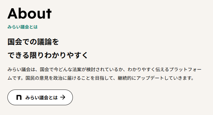 「みらい議会」はその活動の一環で、政治の情報を誰にでも分かりやすく届けることを目的に作られたWebプラットフォームです。
