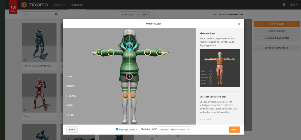 - 画面の指示に沿って、あご・手首・ひじ・ひざ・股の位置を合わせます(=自動リギング用の目印合わせです)