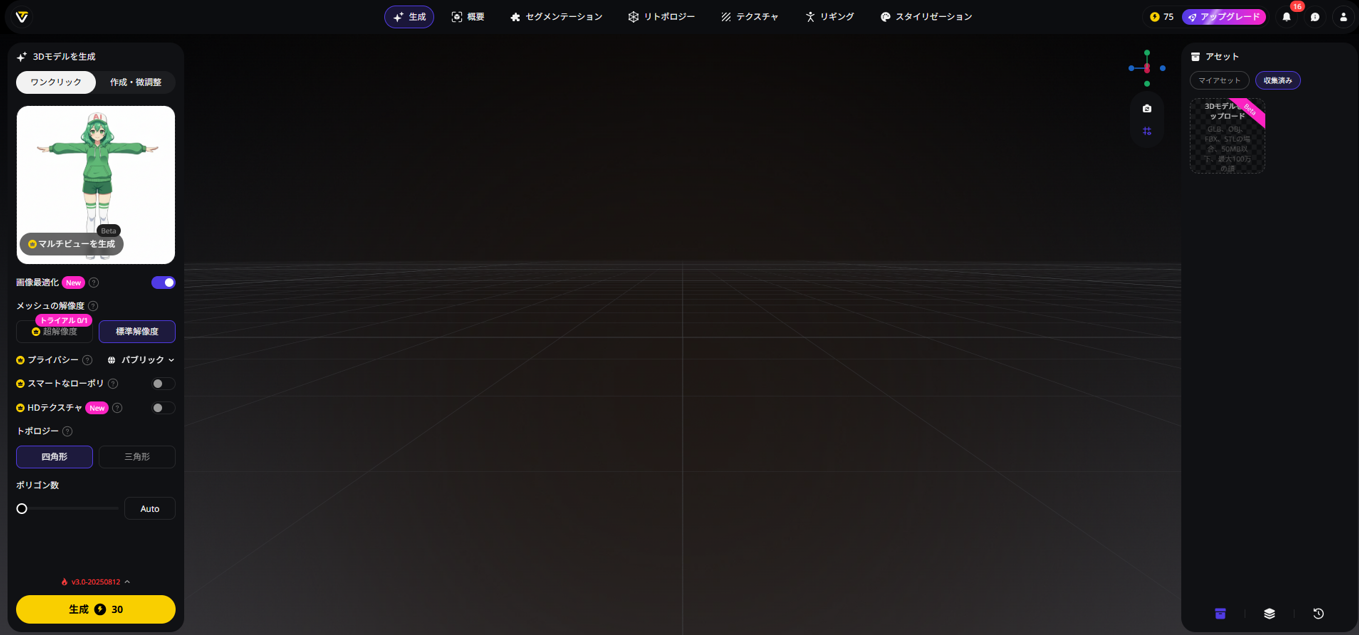 今回は Tripo Studio を使って、手持ちのキャラクター画像から3Dモデルを生成してみました。