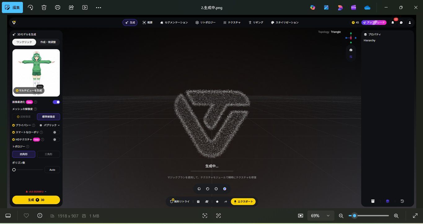 Tripo Studioの生成画面で、元画像を選んで生成を開始します。今回は予め擬人化シンナモをT字ポーズさせたものを用意。これを元に生成します。