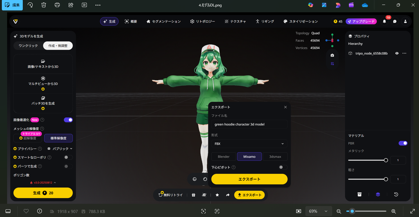 生成したモデルはプレビューで確認できて、形式を選んでエクスポート(作ったデータを書き出して保存すること)も可能。