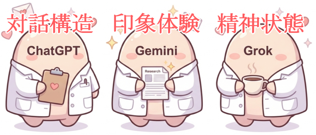 並べてみると、3つのAIは同じ方向を向きながらも、